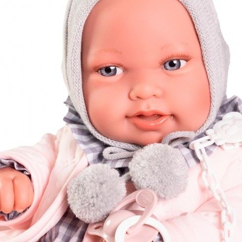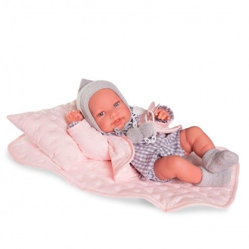 Muñeca recién nacida Pipa con manta acolchada. El bebé de 42 centímetros se parece a un bebé real. Su cuerpo es de suave vinilo sexuado. Lleva un traje de diseño original: un mono de cuadros vichy, con chaqueta de flores y un gorro. Le encanta descansar en su mantita acolchada a juego con su cojín.Edad recomendada: + 3 años.