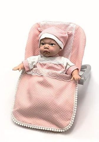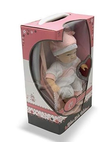 Muñeca de 30 cm con cuerpo blando en porta bebés con saquito a juegoLa muñeca está vestida con traje de punto blanco con ribetes en rosa con topitos blancos en una sola pieza y un gorrito a juegoEsta muñeca bebé incluye un portabebés rosa con el asa en gris que puede rotar para cambiar de posición, de este modo se puede utilizar para transportar al bebé o simplemente como sillita, vestido con un saco en rosa con topitos blancos y ribete de puntilla blancaSe trata de una muñeca interactiva que emite 12 sonidos diferentes de bebé para que los niños interactúen durante el juego y lo hagan más real, favoreciendo situaciones de empatía y sentimiento que les permiten desarrollar la creatividad durante el juegoFunciona con pilas que vienen incluidas.Edad recomendada: + 2 años.