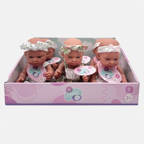 Muñeca bebé de 26 cm presentada en expositor con 6 modelos surtidos. Cada muñeca tiene el cuerpo de plástico resistente y viste una adorable ropita con accesorios a juego, como diademas o gorritas. Su diseño con apariencia natural y expresión dulce la convierte en una compañera encantadora para el juego diario. ¡Colecciónalas todas y disfruta de su ternura y estilo único!Precio unitario, se venden por separado. Se enviarán según stock.Edad recomendada: + 2 años.