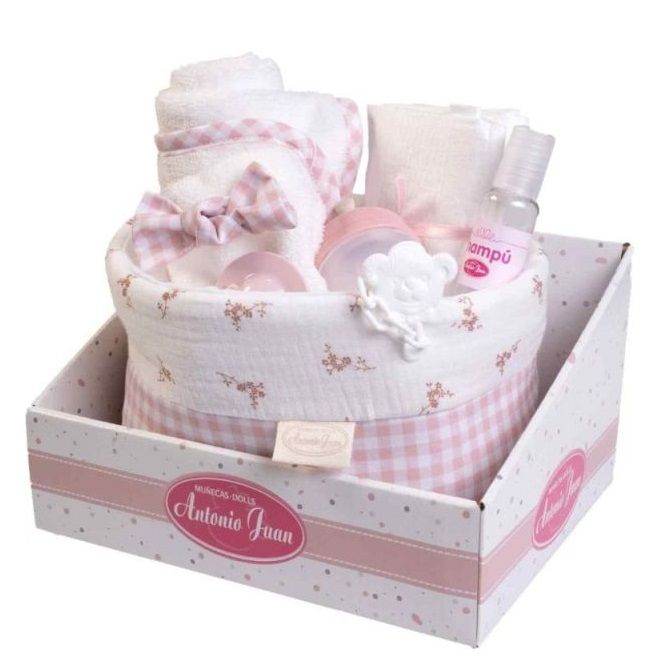 Cesta de tela resistente y eleganteAccesorios variados para juego simbólicoIdeal como regalo ??Compatible con todos los muñecos de la colección Antonio JuanBiberón rosaChupete con cadenaToalla blancaPañalLazo con estampado a juegoChampú decorativo de juguete