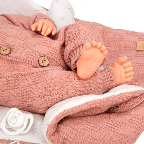A la bebé Elba le encanta jugar y que le arropen en su precioso y calentito saco de dormir. Ha sido elaborado artesanalmente cuidando al máximo cada detalle como rojeces, venitas o decoración de las uñas. Su ropita y saquito de dormir se han confeccionado con tejidos de alta calidad. Como accesorios incluye: saco de dormir, chupete, chupetero, pañal, libro de familia y certificado de autenticidad.Edad recomendada: +3 años.