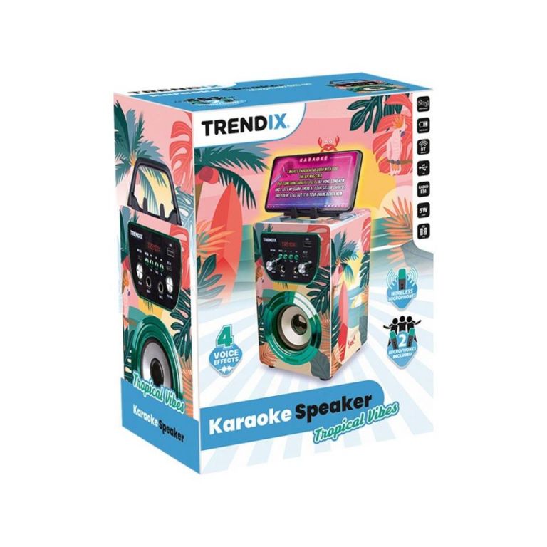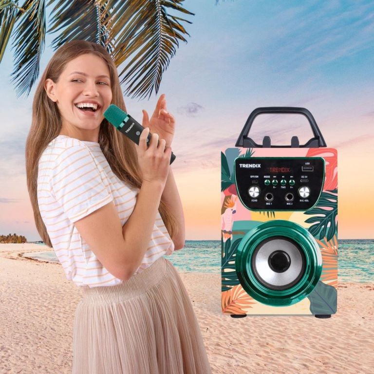 íTu fiesta playera empieza con el Karaoke Tropical Vibes! Siente el ritmo con este karaoke altavoz vibrante que convierte cualquier lugar en una auténtica fiesta tropical. Incluye dos micrófonos inalámbricos con divertidos efectos de voz para que cantes, rías y te expreses sin límites. Su diseño práctico con asa de transporte, pantalla intuitiva, base para tu móvil y ranura USB lo hacen perfecto para llevar a la playa, la piscina o a cualquiera de tus aventuras. Además, disfruta de Radio FM y conexión inalámbrica para reproducir temazos. íQue no pare la música bajo el sol!