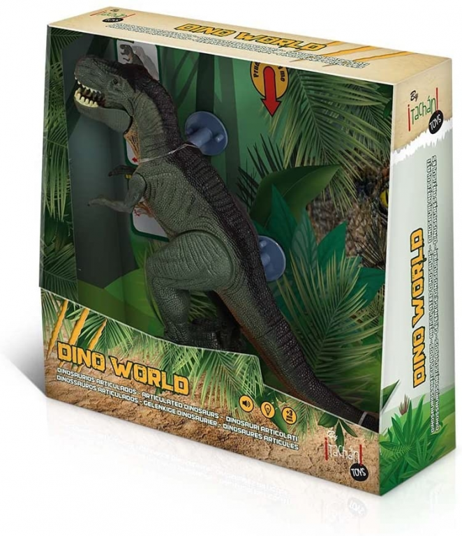 Dinosaurio con luces y sonido y, además, articulado. A parte tiene la función de caminar. Es de un tamaño mediano pero manejable. Estética y color muy realista. Se iluminan los ojos a la vez que suena su gruñido y anda.Edad recomendada: + 3 años.
