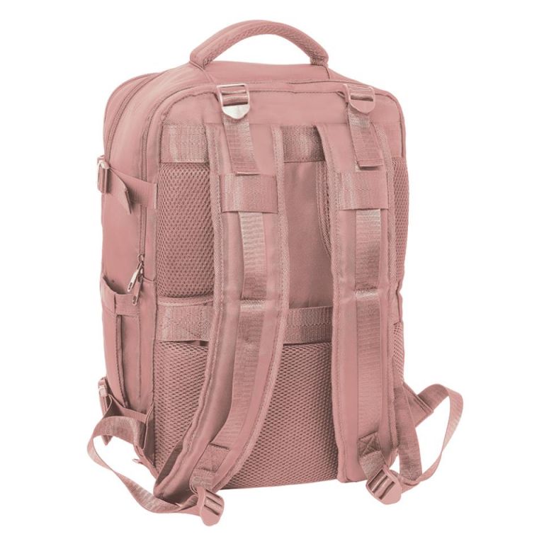 MOCHILA VIAJE CABINA PORTATIL 15,6'' SAFTA "ROSA"1er Compartimento con cremallera de gran capacidad.2º Compartment con organizadores interiores,bolsillo de red con cremallera.3er Compartimento para portatil de 15,6''.Bolsillo lateral portabotella.2 Bolsillos frontales con cremallera.Doble cursor en los 2 compartimentos principales.Conector USB para cargar movil u otros dispositivos electrónicos.Zapatillero con cremallera en la base.Interior totalmente forrado y acolchado.Hombreras ergonómicas y acolchadas con rejilla transpirable.Espalda acolchada con rejilla anti-sudor con cinta adaptable al asa de la maleta.Cintas con cierre de PVC para mantener la mochila compacta.290x190x440 mm ; 23.1 L
