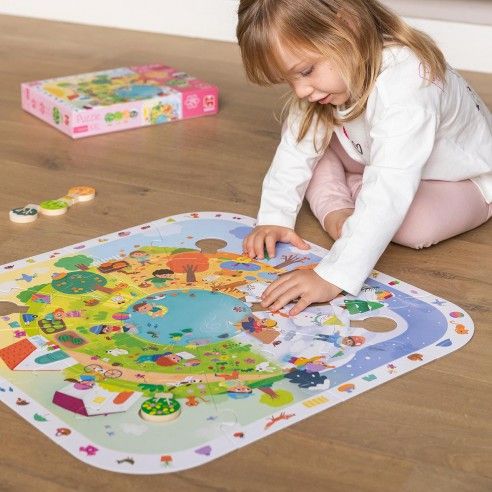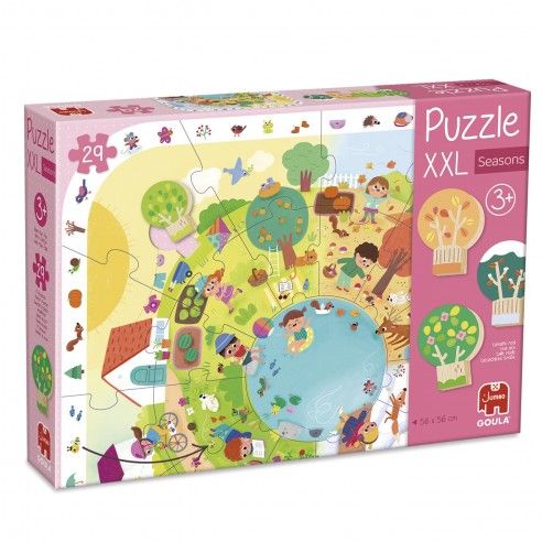 Puzzle XXL de 29 piezas para aprender las diferentes estaciones del año y los cambios en la naturaleza a través del juego interactivo. Incluye 4 piezas de madera para identificar correctamente cada época del año.Edad recomendada: + 3 años.