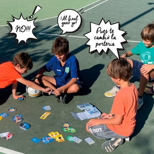 El juego de cartas de fútbol que te hará divertirte como en un juego real. Un juego de cartas de FÚTBOL en el que los jugadores tienen que marcar goles a sus oponentes para eliminarlos y ganar. Las reglas simples hacen de este mazo un excelente pasatiempo y un divertido juego de mesa basado en tu deporte favorito. Las tarjetas de acción específicas simulan las reglas del fútbol para hacerlo aún más divertido, y deben usarse de manera inteligente para lograr la victoria. La baraja incluye comodines borrables para personalizarlos con tus propias reglas y divertirte aún más. 81 cartas: 8 cartas de jugador de 4 colores, 4 goles, 12 balones de portería, 4 cambios, 4 lesiones, 1 cambio de campo, 4 tarjetas rojas, 4 tarjetas amarillas, 4VAR, 4 fuera de juego. Incluye 3 cartas Joker para definir tus propias reglas.Edad recomendada: + 6 años.