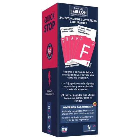 ¡Una experiencia caótica y desternillante para tus fiestas! Quick Stop Indecente es la versión más rebelde del clásico juego: rápido, atrevido y perfecto para 2 a 7 jugadores. Deshazte de tus letras respondiendo categorías divertidas y descaradas. El primero en quedarse sin cartas gana la ronda. El primero en ganar 3 rondas, gana la partida.Edad recomendada: + 16 años.
