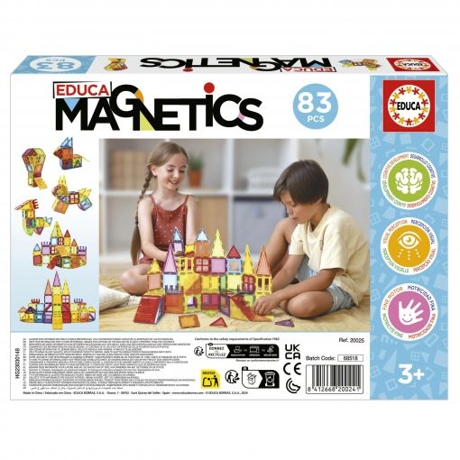 Construye figuras geométricas desarrollando la creatividad, imaginación, percepción visual, motricidad fina y el desarrollo cognitivo.83 bloques magnéticos de alta calidad y seguros para los niños gracias a su acabado redondeado.Crea figuras o edificios y con los imanes se mantendán unidos.Estimula su mente y creatividad: los magnetics son una actividad perfecta para imaginar, construir y aprender, además de estimular la curiosidad y la imaginación de los niños.Incluye 83 piezasLos más pequeños podrán construir en 2D y 3D, dando rienda suelta a su imaginación y creatividad.Gracias a sus colores, formas y facilidad de manejo, se pueden crear infinidad de construcciones (personajes planos, animales, flores, vehículos, torres, castillos, etc.).Las piezas están reforzadas en su interior con gruesos y potentes imanes que las mantienen unidas de forma segura, dando máxima estabilidad a las construcciones.Las caras nunca se repelen.Edad recomendada: + 3 años.