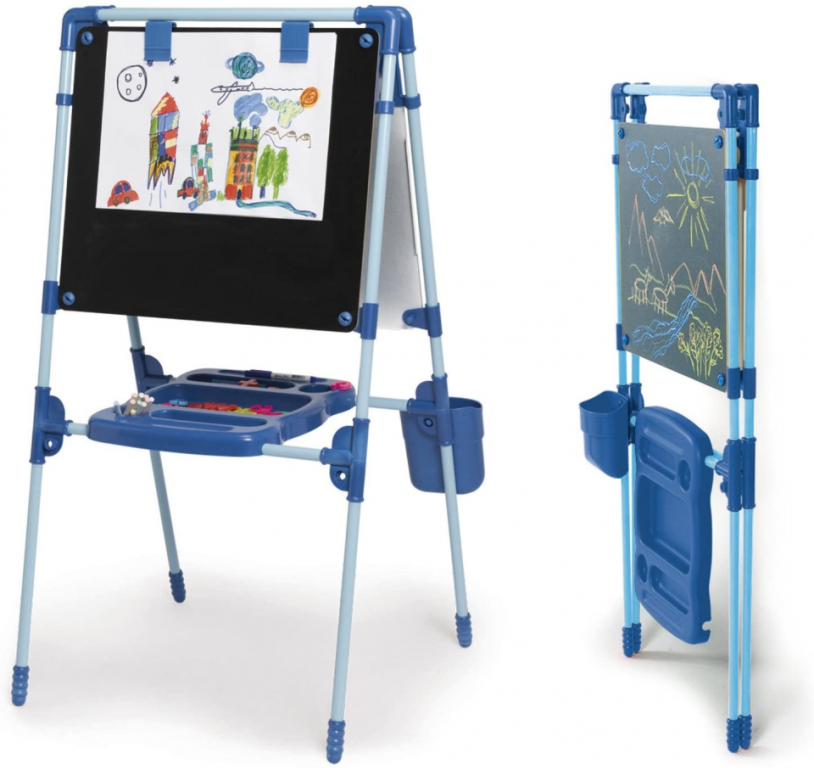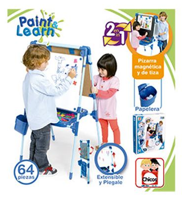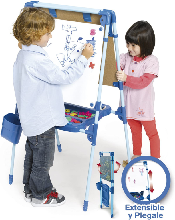 Pizarra 2 en 1: por un lado tizas y por el otro rotuladores borrables y piezas magnéticas.Incluye un rotulador, tizas de colores e imanes de letras y númerosExtensible y plegable; con patas de metal.Edad recomendada: + 3 años.