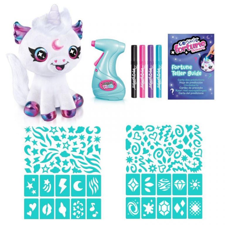 Personaliza tu peluche con tu spray, tus rotuladores y tus plantillas. Lava tu peluche y ¡vuelve a hacerlo! Haz una pregunta a tu Unicornio Cósmico y presiona su cuerno: ¡se iluminará! Descifra la respuesta a tu pregunta con la guía de adivinación.Pilas:· 2 pilas LR6 (no incluidas).· 3 pilas LR44 (incluidas).Edad recomendada: + 6 años.