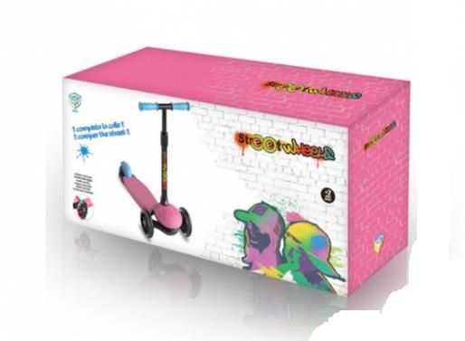 Patinete de 3 ruedas de diseño propio. Incluye: Barra de dirección de aluminio y ajustable en altura. Fácil montaje y desmontaje con un solo clic Plegable y fácil de transportar a cualquier parte Puños antideslizantes con punta redondeada (para evitar golpes) Plataforma con alta resistencia contra golpes e impactos Ruedas con luces de led Freno trasero que no se calienta ni desgasta la rueda Peso 1,9 kg Carga máx. 50 kg Dimensiones 68 cm alto, 53 cm largo, 23 cm ancho.Edad recomendada: + 2 años.