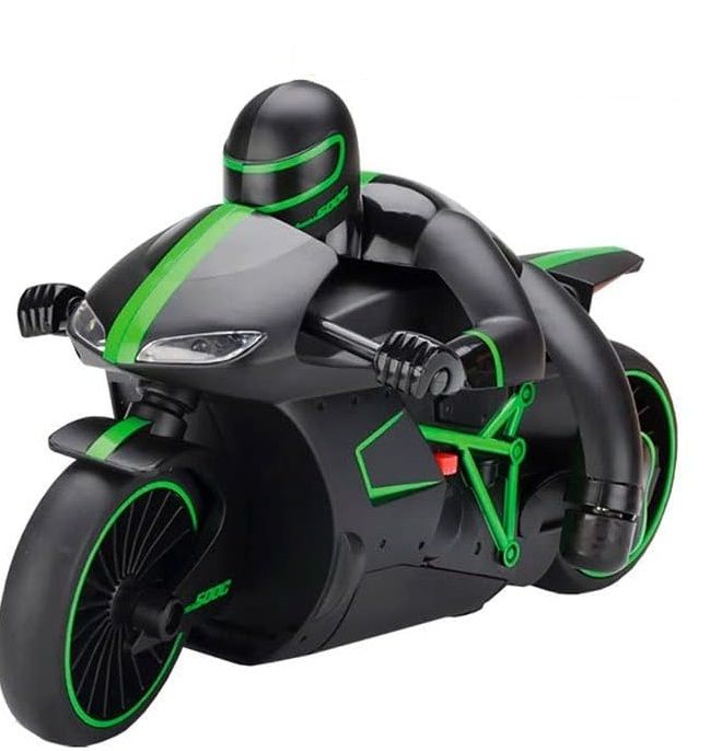 Gran moto de carreras dirigida con control remoto donde la diversión está asegurada en carreras desafiantes; puede realizar giros y derrapes y sus ruedas de goma presentan gran adherencia al suelo para hacerla más estableEsta moto posee luz y junto con su diseño deportivo en negro y sus detalles verdes, le aportan un aspecto potente y velozEsta diseñada a escala 1:18 y con el control remoto los niños pondrán a prueba sus destrezas de conducción así como de concentración para dirigir la moto y realizar carrerasLa duración de la batería permite hasta 25 minutos de juego sin interrupción; el tiempo de carga es de 3 horas y después la moto está lista para volver a hacer carreras; esta moto puede alejarse hasta 40 ó 45 metros desde el control remotoFunciona con pilas recargables no incluidas; está recomedada para niños a partir de los 3 años