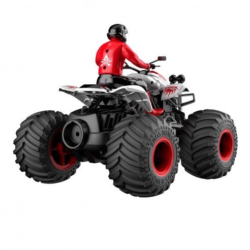 Quad RC escala 1:16 con humo. Posee ruedas grandes y todoterreno para poder ir por cualquier tipo de pavimento. Puede alcanzar una velocidad máxima de 20km/h.Edad recomendada: + 3 años.