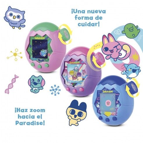 Tamagotchi Paradise, ¡la nueva forma de criar a tu Tamagotchi! Ahora el dispositivo cuenta con una funcionalidad Zoom para viajar desde el espacio Tamagotchi hasta la propia célula del personaje. Existen 3 modelos diferentes, cada uno con un espacio y temática diferente: Tierra, Mar y Aire. Existen hasta 12 especies diferentes y puedes cuidar un total de 1.000 personajes.Edad recomendada: + 6 años.