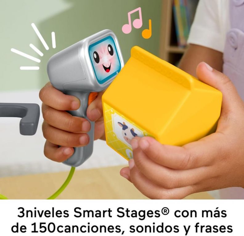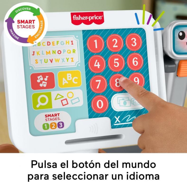La Caja registradora para contar y comprar de Laugh & Learn de Fisher-Price es un juguete electrónico de aprendizaje que enseña a los niños y niñas en edad preescolar los números y contar, el alfabeto, los colores, las formas y mucho más. Los peques pueden pulsar los 15 botones de la caja registradora o utilizar el escáner para escuchar más de 150 canciones, sonidos y frases. Esta tienda de juguete interactiva incluye 20 piezas de juego y 3 niveles de aprendizaje Smart Stages para fomentar la imaginación y el juego de imitación mientras los niños y niñas compran, pasan por caja y pagan. Utiliza el botón del mundo para seleccionar un idioma: castellano, inglés, italiano o portugués.Edad recomendada: + 2 años.