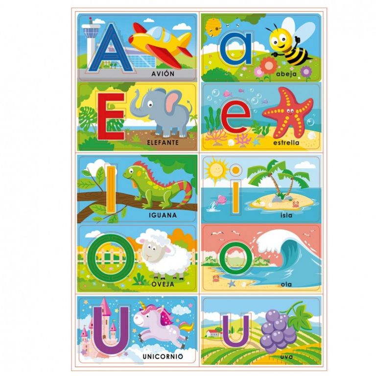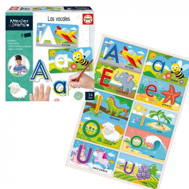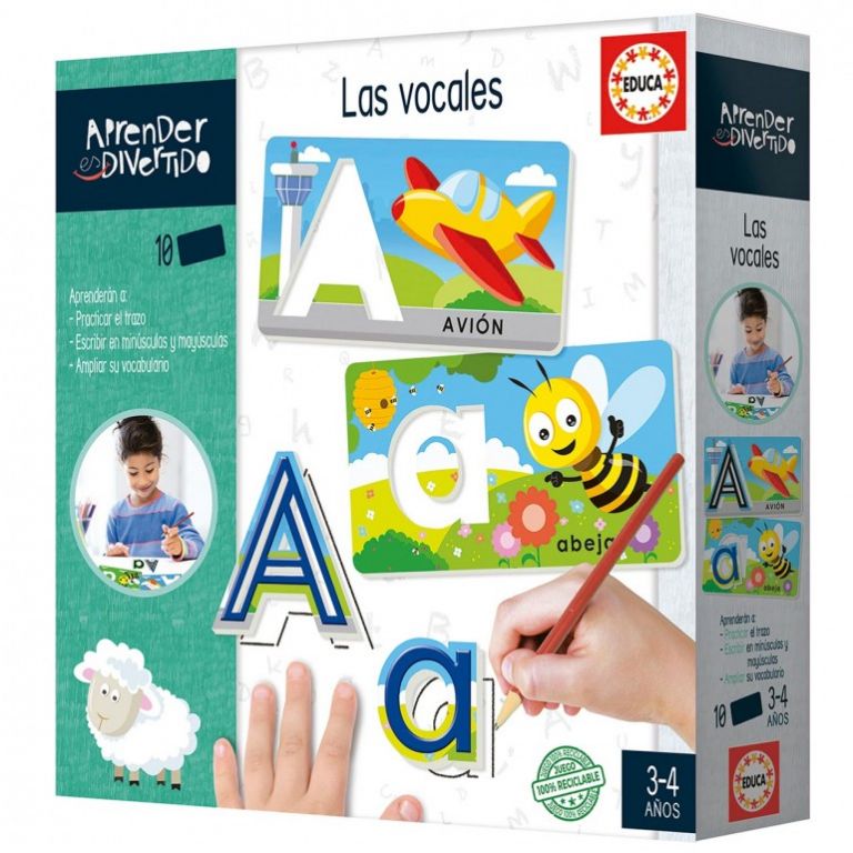 Con este divertido juego podrán iniciarse en el conocimiento de las vocales y practicar el trazo con los encajables incluidos. Los más pequeños descubrirán cada una de las vocales, tanto en mayúsculas como enminúsculas.Contenido: 10 láminas con plantillas de letra extraíble, 1 lápiz incluido e instrucciones.Edad recomendada: + 3 años.
