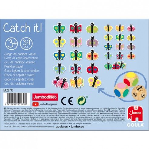 Goula Catch It Butterfly ¡Sé el primero en encontrar la combinación! ¡El juego de agilidad visual ideal para los más pequeños de la casa! Goula Catch It nos soprende con esta versión con mariposas multicolores en un juego que combina aprendizaje y diversión. Cómo Jugar Se colocan todas las fichas mezcladas con el dibujo de las mariposas hacia arriba. Por turnos se lanzan los 3 dados y todos los jugadores tienen que encontrar al mismo tiempo la combinación que indican los dados (mariposa grande o pequeña y de los colores que aparecen en los dados). El jugador que consiga más mariposas será el ganador de la partida. Sobre Goula Los juguetes que ofrece Goula son de los más demandados por los padres gracias a su amplio catálogo y variedad de juegos educativos de madera con los que los más pequeños de la casa aprenderán con juegos de rapidez, observación, puzzles e incluso un montón de actividades divertidas para no dejar de aprender. El grupo Jumbodiset se preocupa por el medio ambiente. Prestando atención a los materiales , la producción y las personas intetamos dar pequeños pasos para hacer del mundo un lugar mejor.Edad recomendada: + 3 años.