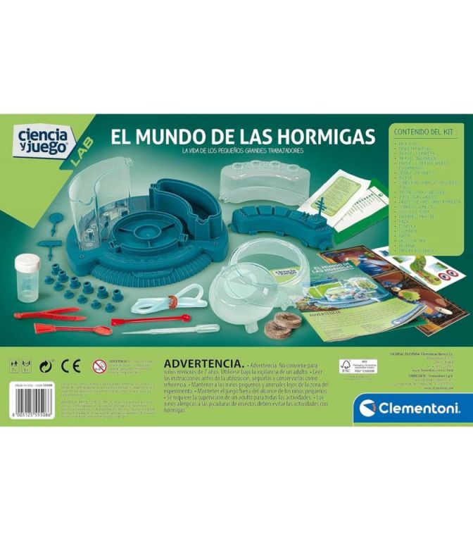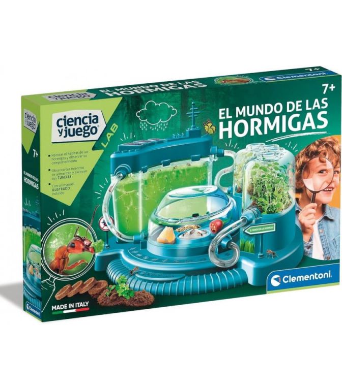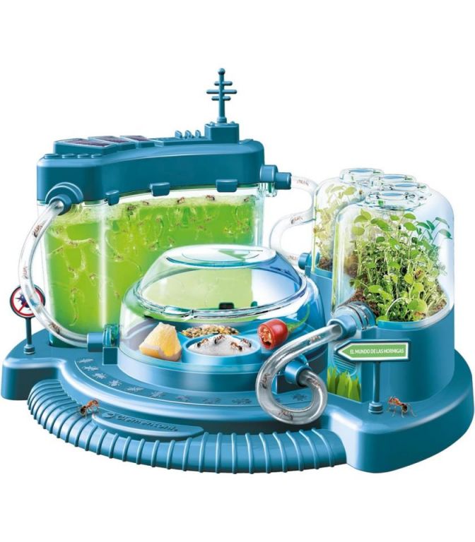 Un conjunto modular para recrear el entorno vital de las hormigas y observar su comportamiento.Cuenta con una zona en la que pueden cavar túneles, un módulo botánico para observarlas en la superficie y un entorno especial para entender cómo se alimentan.Un soporte de juego integrado contiene los tres entornos y todas las herramientas para estudiar mejor su vida.Los módulos están conectados entre sí por un tubo transparente que permite a las hormigas pasar fácilmente de un entorno a otro.¡Un juego con muchas funciones diferentes y complementarias para entender mejor la ecología de estos insectos y observar sus hábitos de vida!Edad recomendada: + 7 años.