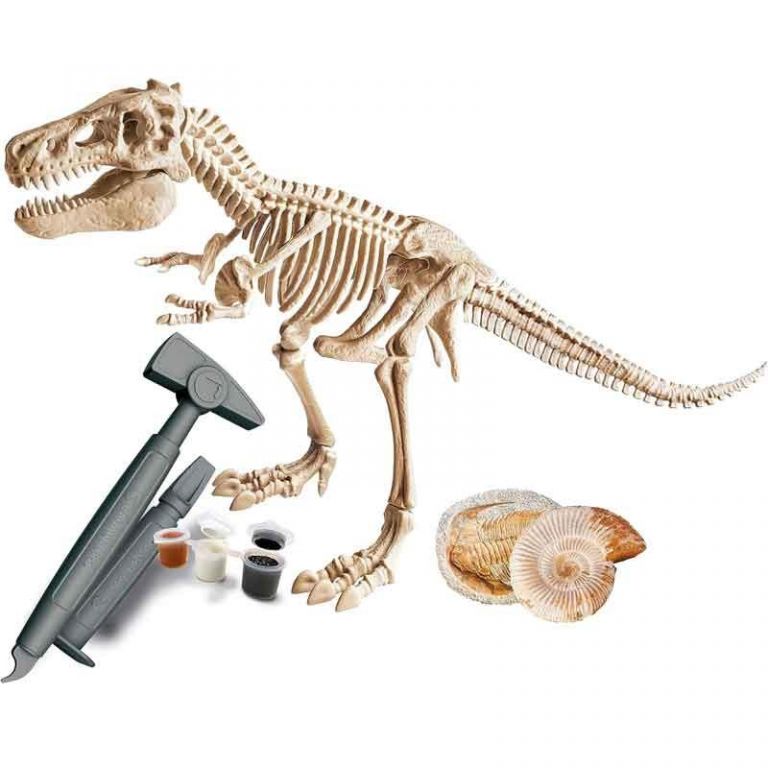 Descubre este juego de dinosaurios y adéntrate en el mundo de la arqueología infantil.Un esqueleto de dinosaurio T-Rex está enterrado dentro del ladrillo de yeso y solo un verdadero paleontólogo puede desenterrarlo.Excava el ladrillo con un martillo y un cincel y recupera todos los huesos del esqueleto del dinosaurio T-Rex para montar, para sumergirte en la prehistoria.Además, podrás revivir la magia de los dinosaurios y reproducir la huella del temible T-Rex con arcilla; así podrás tener la experiencia completa de un verdadero paleontólogo.Edad recomendada: + 7 años