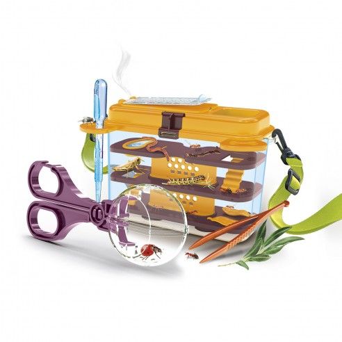 Un completo kit científico para construir una casa para insectos, cuidarlos y guardarlos, descubriendo su mundo y observando sus costumbres. El set incluye una caja de fauna transportable y con baldas, pinzas, lupa, recipientes, herramienta de captura en forma de tijera y correa de hombro. Las baldas del interior de la casa están preparadas para montar. El kit permite aprender de manera fácil y segura un montón de curiosidades sobre el mundo de los insectos.Edad recomendada: + 8 años.