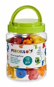 Bote de 72 unidades de letras y números imantados de colores para pizarras magnéticas.Edad recomendada: + 3 años.