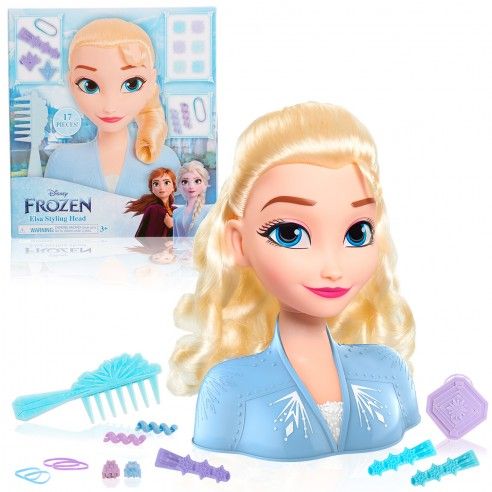 ¡La cabeza para peinados Disney?s Frozen 2 Elsa Styling Head ofrece infinitas posibilidades para jugar a las peluquerías! Elsa tiene un precioso y brillante pelo rubio que a los niños les encanta cepillar y peinar. La cabeza para peinados de Elsa incluye 17 divertidos accesorios para ponerse en el pelo y compartir, que incluyen un peine, una pinza, dos pasadores de pelo, dos espirales para el pelo, cuatro gomas y 6 adornos. ¡Los niños pueden cepillar el pelo de Elsa con el cepillo y crear un montón de peinados divertidos! A los niños les encantará usar las preciosas horquillas para peinar y decorar los brillantes y vaporosos rizos de Elsa.Edad recomendada: + 3 años.