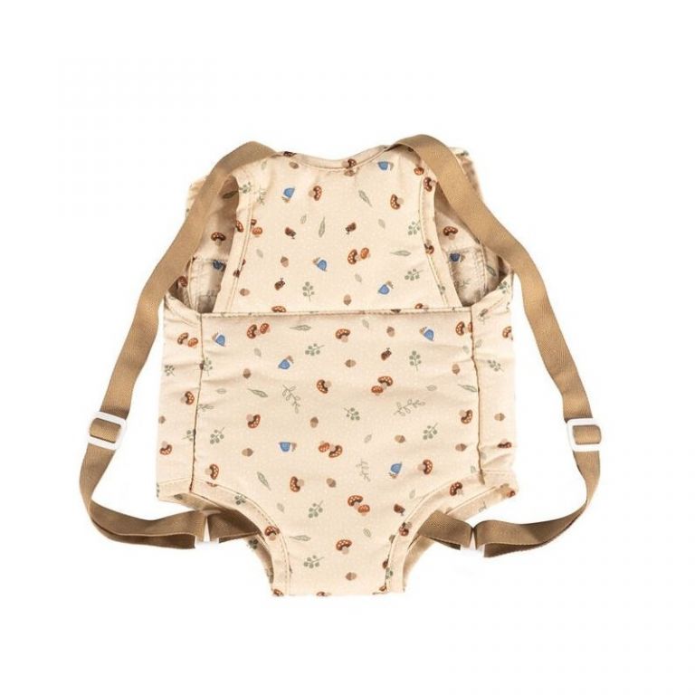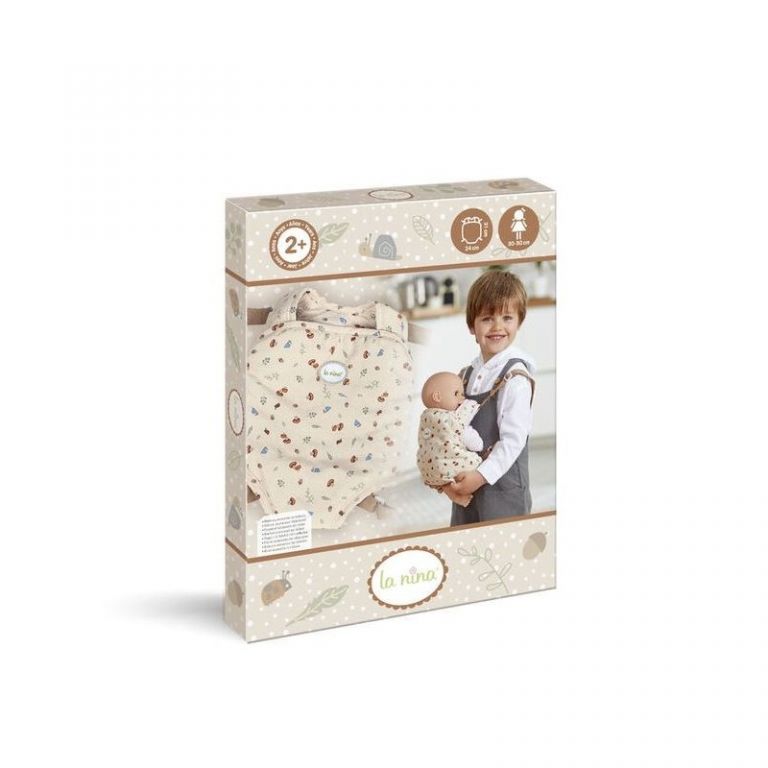 Mochila portabebés con estampado neutro y con elementos inspirados en el bosque, muy cómoda para llevar al muñeco a todas partes y con asas regulables. El muñeco que puede ir en la mochila puede medir entre 30 y 46 cm. Puede lavarse a máquina.Edad recomendada: + 2 años.