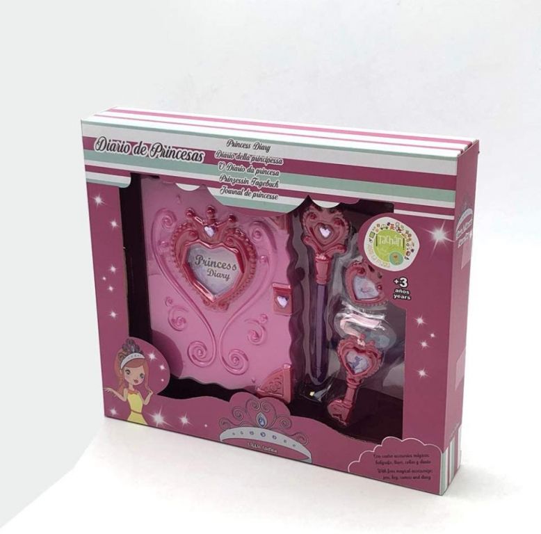Diario de princesas con diseño en rosa y ventana en relieve. El diario se abre y cierra con llave secreta. El diario incluye también un bolígrafo y un colgante camafeo. La ventana del diario se ilumina. Contiene compartimentos secretos. Funciona con pilas que no vienen incluidas. Edad recomendada: + 3 años.