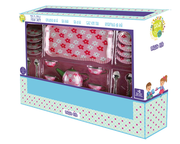 Set de te de juguete. Fabricado en metálico y pintado en rosa. 19 piezas en total entre las que incluye tazas, platos pequeños y grandes, tetera y cubiertos. Un completo conjunto para tomar el té imaginario con los muñecos o con los amiguitos. Fantástico para el fomento del juego de imitación con el que los niños desarrollarán importantes aspectos del crecimiento mientras se divierten a lo grande.