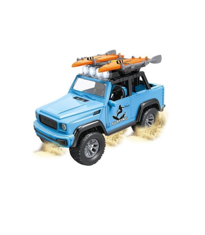 Suv 4x4 surfero con luces y sonidos. Lleva focos, tablas de surf y un armazón para protegerlo en las caídas.Edad recomendada: + 3 años.