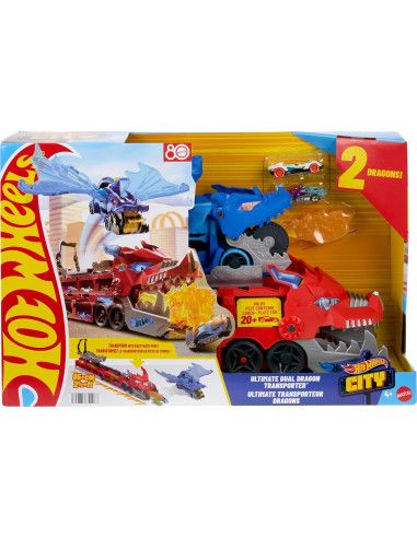 El Dragón transportador con ataque doble definitivo de Hot Wheels ofrece el doble de acción con unos fieros dragones que derribarán y se comerán tus coches, los cuales podrás guardar más tarde en su interior. ¡Muévete o serás derribado por el gigantesco dragón, de cuya boca sale una especie de fuego que derriba los coches y camiones que se interponen en su camino! Libera el segundo dragón para transformar el más grande en una enorme pista de carreras de dos carriles. Haz que el dragón más pequeño salga de caza: ¡la presa son los coches! Pulsa un botón para que bata las alas y se abalance sobre los vehículos desprevenidos. Lanza rodando a la bestia hambrienta hacia ellos y observa cómo los engulle. ¡Vuelve al dragón grande y libera a dos vehículos en el lanzador para que salgan disparados y compitan en la pista doble! El conjunto incluye dos vehículos Hot Wheels metálicos a escala 1:64, y los dragones pueden almacenar más de 20 vehículos. (Los vehículos adicionales se venden por separado). Los niños y niñas pueden fijar la pista de Hot Wheels a la parte delantera del dragón para guiar a los corredores por rutas específicas o lanzarlos libremente.Edad recomendada: + 4 años.