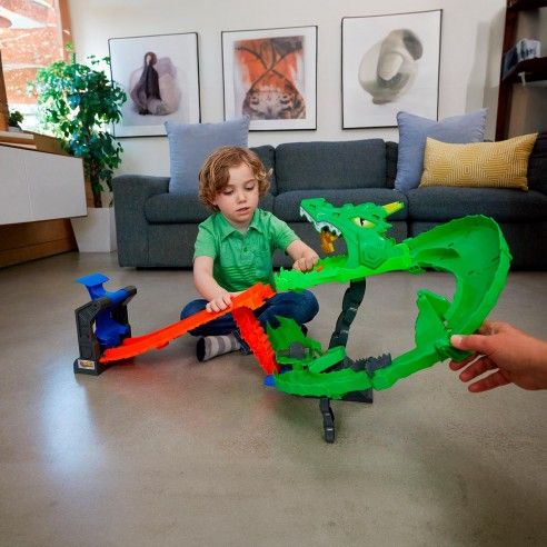 Los Monster Trucks de la serie Sharks vs. Dinos de Hot Wheels se unen para derrotar al dragón cíborg en el conjunto Destrucción del dragón. El conjunto está inspirado en la serie infantil de YouTube ?Sharks vs. Dinos?, de modo que los personajes de Monster Trucks Great Bite y Rageasaur pueden correr a toda velocidad hacia la némesis cíborg y pasar por un desviador de motosierra para escapar. El desviador de motosierra determinará de forma aleatoria uno de los tres desenlaces posibles para los camiones.Edad recomendada: + 4 años.
