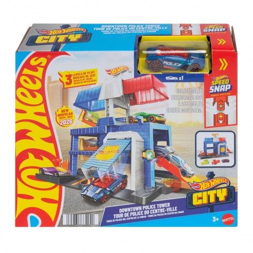 Explora la Torre comisaría de policía de Hot Wheels City, que se amplía a 3 niveles y permite imaginar miles de aventuras. En el ascensor, accionado por los peques, se llega hasta la segunda planta, donde se ofrecen varias vías de salida: bajar a toda velocidad por la rampa a través de la salida lateral o golpear el desviador de la señal de stop para salir por la puerta de la planta baja. Tira del cartel de Hot Wheels para descubrir el puesto de observación. Los coches pueden aparcar aquí hasta que se les llame para entrar en acción y vigilar Hot Wheels City a través de las ventanas translúcidas de color rojo y azul. Incluye un coche de policía metálico de Hot Wheels a escala 1:64 para que puedas jugar nada más sacarlo de la caja.Edad recomendada: + 3 años.