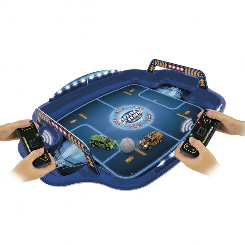 Goalcars Supercup combina la conducción de vehículos de radio control con técnicas de fútbol. Contiene dos vehículos a escala 1:64 equipados con luces, batería y emisora 2.4Ghz. Un estadio de juego montable-desmontable con unas medidas 70x50 cm y un diseño totalmente futurista.Edad recomendada: + 6 años.