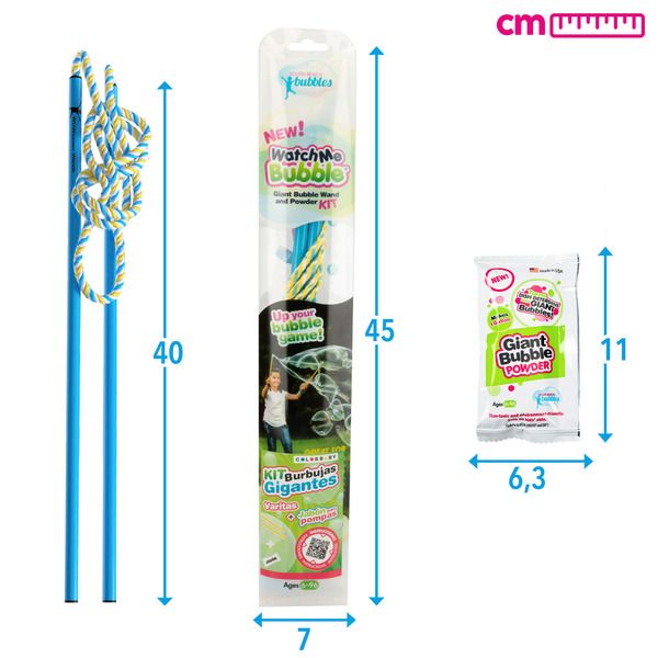 Con este kit de burbujas gigantes WOWmazing serás el alma de la fiesta. ¡Todos quedarán boquiabiertos con el tamaño de las burbujas!Incluye: 2 varitas de 40 cm de largo unidas por cuerdas superabsorbentes, 1 sobre de jabón en polvo WOWmazing especial para burbujas gigantes y 1 folleto con consejos y trucosCómo jugar: vierte 16 tazas de agua en un cubo grande. En un recipiente aparte mezcla 1 taza de detergente para lavar los platos y 1 sobre de jabón en polvo. Añade esta mezcla en el cubo grande con agua, remueve y ¡listo para sumergir las varitas y crear miles de pompas gigantes! Juego seguro: el jabón es seguro, ecológico, no tóxico y biodegradableEdad y valores: juguete recomendado a partir de 6 años que favorece el juego al aire libre y desarrolla la coordinación y la motricidad global