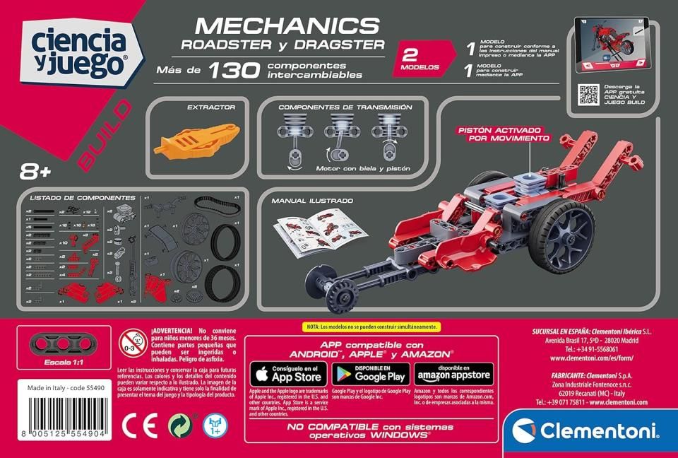 Un juego educativo de ciencia y construcciones; fabricado para divertirse montando y modelando un Roadster y un quad; podrás montarlos y desmontarlos las veces que quierasEl juego de construcciones contiene más de 90 piezas para construir 2 modelos diferentes con mecanismos de transmisión para construir 2 vehículos diferentesEl manual ilustrado permite montar la moto roadster paso a paso, mientras se aprenden distintos conceptos de ingeniería y mecánica básicaMuchas piezas especiales, como el módulo de transmisión, los engranajes, las poleas y pistones y otros elementos, permiten observar el funcionamiento de los vehículosLa aplicación Ciencia y juego, Build complementa la experiencia de juego proporcionando ayuda para el montaje de todos los modelos gracias a las animaciones interactivas en 3D